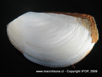 Concha transversalmente alargada, aplanada. Lado anterior corto y curvo, posterior largo y truncado. Valva derecha plana izquierda convexa y con dos quillas oblicuas en la parte dorsal posterior. Con Periostraco. Umbos ubicados en el tercio anterior. Charnela formada por láminas dentiformes. Interior de las valvas nacarado. Tamaño aproximado de la concha de 25 mm (Forcelli, 2000).