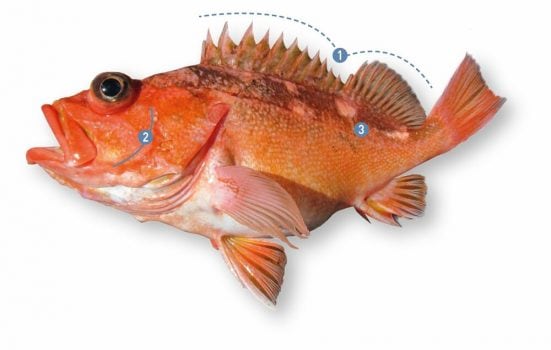 1. Cuerpo ovalado y fuertemente comprimido de coloración anaranjada. Cabeza grande con numerosas protuberancias, placas óseas y cavidades. 2. Membranas o perculares negras. 3. Aleta dorsal con 5-6 espinas...