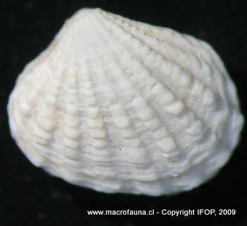 Superficie con 11 a 14 costillas radiales nodulosas, separadas por surcos anchos. Concha trapezoidal, equivalva e inequilateral, umbos anteriores. Charnela de la valva izquierda con dos dientes cardinales y dos laterales, valva derecha con tres dientes cardinales y dos laterales. Ligamento externo (Ramorino, 1968). Largo aproximado de la concha 6 mm (Forcelli, 2000).