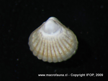 Concha triangular, comprimida. Borde dorsal formando ángulo recto con los umbos. Superficie con unas 15 costillas radiales bajas cruzadas por estrías concéntricas de crecimiento, con gránulos en los surcos. Margen interno dentado. Blanco. Tenue periostraco oliváceo. Largo aproximado de la concha de 5 mm (Forcelli, 2000).