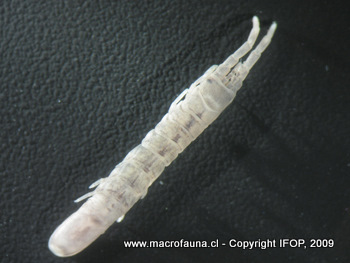 Margen frontal del cefalón ligeramente cóncavo, lámina frontal triangular, clípeo bífido extendiéndose hacia adelante en lugar de la lámina frontal. Ojos oblongos, transversos, localizándose en margen del cefalón. Tres últimos pares de placas coxales puntiagudas en dirección postero-lateral. Pleón con tres somitos visibles e incisión lateral indicando un cuarto; ápice del pleotelson redondeado. Flagelo de la primera antena con un único artejo, segundo con 4 artejos. Urópodo birrámeo. Cuarto par de pereiópodos diminuto, dirigido lateralmente. Partes antero-laterales del pleon con flecos de delicadas setas (Menzies, 1962).
