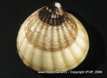 Concha oval redondeada, posteriormente angulada y con umbos prosogiros, casi centrales. Externamente presenta dieciocho estrías radiales gruesas y muy marcadas. Las estrías concéntricas son muy finas y atraviesan a las radiales. Su coloración externa es en tonos café amarillento a rojizo (Ramorino, 1968). Internamente el margen ventral es crenulado y refleja claramente la escultura externa. La charnela tiene un grueso cardinal anterior con forma triangular y un alargado y delgado cardinal posterior. Los dientes laterales son pequeños (Guzman et al., 1998). Alcanzan tamaños de aproximadamente 12 mm de longitud (Forcelli, 2000).