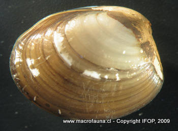 Concha de regular tamaño (hasta 20.6mm de longitud), gruesa subovalada, inflada, de color blanco amarillento, opaca. Periostraco brillante, con bandas concéntricas irregulares de color oliva claro, que se alternan con bandas más oscuras y aumentan su tono hacia el borde ventral, llegando hasta pardo negruzco. Con depósitos de un material oscuro en la región dorsal, que pueden llegar a cubrir la concha completamente. Umbos inflados, amplios, ubicados en el tercio posterior de la concha, ápices opistogiros. Borde dorsal anterior suavemente arqueado y casi el doble más largo que el posterior, que es recto; márgenes anterior, ventral y posterior redondeados. Ornamentación formada por estrías de crecimiento que, al cruzar el borde del escutelo se dirigen en forma oblicua hacia los ápices y estrías radiales tenues e irregularmente dispuestas, visibles con mayor facilidad en la parte ventral y en los individuos jóvenes. Lúnula subcordada, plana junto a los ápices, delimitada por una línea más clara en el periostraco; escútelo no delimitado. Interior de las valvas blanco verdoso, nacarado con brillo iridiscente, rara vez de color verde. Serie de dientes de la charnela formando un ángulo casi recto. Condróforo ancho. Impresiones de los aductores muy profundas. Impresión de los músculos medios una más arriba que la otra. Impresiones puntiformes dispersas (Villarroel & Stuardo, 1998).