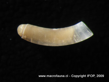 Tamaño aprox de 1.5 mm. Cilíndrico, moderadamente curvo, vítreo, algo opaco, liso. Abertura circular con borde delgado hacia fuera. Lado contrario a la abertura cerrado por un septo oblicuo. Blancuzco (Forcelli, 2000).