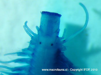 Cuerpo corto, prostomio con dos pares de ojos, tres antenas y dos palpos articulados. Probóscide inerme pero con papilas marginales. Ocho pares de cirros tentaculares. Parápodos birremos pero con notópodos reducidos de donde nacen unas pocas notosetas capilares. Neurópodos largos con neurosetas falcígeras (Díaz et al., 2009). Primeras setas a partir del segundo segmento. Probóscide eversible con 40 papilas distales, mandíbulas ausentes (Fauchald, 1977).