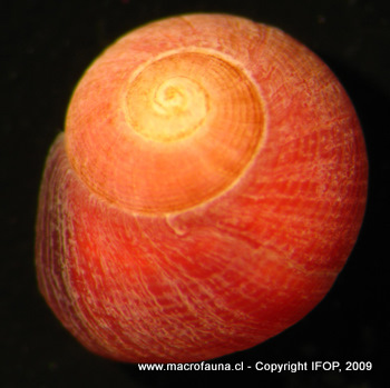 Conchilla pequeña, casi globosa, umbilicada. Espira aplanada con más de cuatro vueltas y media, incluída la protoconcha. Las vueltas no nepiónicas están surcadas por finas estrías espirales aproximadas y estrías de crecimiento oblicuas. La penúltima vuelta de lado derecho es muestra gibosa y la última vuelta es muy convexa a la izquierda, casi desproporcionada con respecto de la parte derecha. Abertura subcircular, nacarada internamente. Labro fino. Conchilla color rosado vivo, que la destaca fácilmente (Ageitos, 1988).
