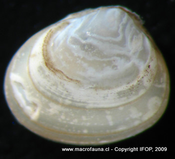 Concha pequeña, de aproximadamente 25 mm de longitud. Elíptico algo globoso, frágil, traslúcido. Un lado corto y el otro largo. Extremos redondeados. Superficie lisa con estrías de crecimiento (Forcelli, 2000).