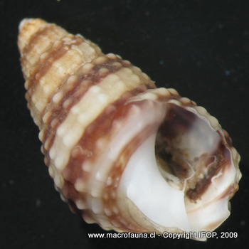 Concha pequeña a tamaño medio, con altas espiras, abertura ovada, y corto canal anterior. Superficie con unos 10 cordones longitudinales y espirales que al cruzarse forman nódulos. Abertura con lado interno del borde externo con 5 pliegues a la manera de dientes. Callo columelar fuerte y blanco. Canal basal corto y borde dorsal con canal profundo (Forcelli, 2000).