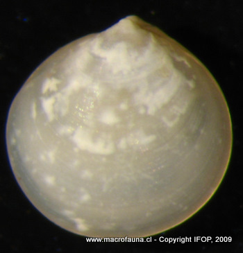 Microvivalvo de color blanco y de forma casi circular. Umbos grandes prominentes. Lado dorsal convexo formando ángulo obtuso con el umbo, lado ventral redondeado. Superficie con estrías concéntricas, finas, apretadas e irregulares. Interior blanco brillante, periostraco amarillento (Forcelli, 2000)