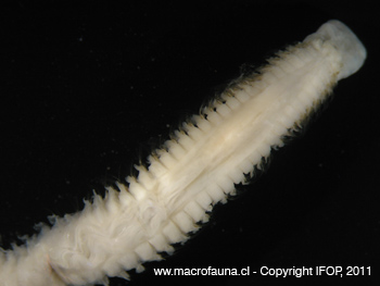 Prostomio ligeramente pentagonal, un poco más largo ancho, borde anterior levemente convexo. Sin ojos, ni manchas oculares visibles. El prostomio no es pigmentado, Sólo presenta una pequeña mancha más o menos central color herrumbre. Dos pares de antenas algo aplanadas. Dos pares de antenas algo aplanadas, triangulares. La probóscide evaginada es bastante conspicua, posee 22 a 24 filas longitudinales de papilas cónicas con 6 7 papilas en cada fila. Los parápodos están muy bien desarrollados a lo largo de todo el animal. Los cirros branquiales interramales son curvados hacia afuera y densamente ciliados en su contorno. El primero aparece a partir del 4º segmento setígero y están presentes hasta el final del cuerpo. La lámela notopodial dorsal es oval en los segmentos anteriores y alargada en los segmentos medios y posteriores. El cirro notopodial, ubicado en la base de la branquia, es digitiforme en todos los parápodos. La lámela neuropodial post-setal es de base ancha, alargada y aplanada, en los segmentos anteriores. En los segmentos posteriores es redondeada y en parte es sobrepasada en longitud por la lamela presetal. En el ángulo superior del neurópodo se destaca nitidamente la formación de un lóbulo accesorio, que es aplanado en ciertos parápodos y en otros digitiforme.Las cerdas preaciculares, notopodiales y neuropodiales, son barreadas, cortas y con extremo distal curvado. Las postaciculares son espiniformes, largas y terminan en punta fina. Pigidio cónico con un largo filamento medio ventral (Rozbaczylo & Castilla, 1974).