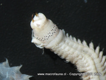 Prostomio con dos antenas y dos pares de ojos. Cuatro pares de cirros tentaculares, los dorsales más largos. Probóscide con paragnatos cónicos distribuidos de la siguiente manera: área I= 2 ó 3; área II= 20, dispuestos en tres filas formando una banda oblicua; área III= aproximadamente 46, dispuestos formando un óvalo; área IV= 28-30, dispuestos en forma triangular; área V= 0; área VI= 4, dispuestos en forma de cruz; áreas VII-VIII= con aproximadamente 60, dispuestos en filas irregulares, alternándose paragnatos pequeños y grandes. Primer y segundo par de parápodos unirramosos, los restantes birramosos; en los posteriores los lóbulos están alargados y bien separados entre sí y los extremos distales están pigmentados. Notopodos anteriores con setas compuestas espiniformes homogonfas; los medios y posteriores, además de las espiniformes homogonfas llevan falciformes homogonfas. Neurópodos con falciformes heterogonfas y espiniformes homogonfas (Rozbaczylo et al., 2006).
