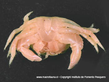 Cangrejo pequeño (máx. 40 mm AC), de caparazón robusto, grueso, suborbicular, marcadamente convexo sobre el dorso en sentido fronto-caudal; superficie del caparazón y de las quelas cubierto de tubérculos gruesos, romos, de aspecto granular. Pedúnculos oculares muy cortos de modo que los ojos parecen hundidos dentro de las órbitas. Quelas cortas y macizas, con el dedo fijo (pólex) notoriamente dirigido hacia abajo. (Díaz et al, 2009).Margen antero-lateral del caparazón con 5 ó 6 dientes irregulares. Pereiópodos delgados (Retamal, 2000).