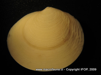 Concha ovalada, gruesa, generalmente blanca. El borde ventral, principalmente en los adultos, presenta un periostraco en tono verde oliva. Los umbos son casi centrales, levemente desviados hacia el extremo posterior. La valva derecha es más convexa que la izquierda. La superficie externa presenta una gran cantidad de estrías concéntricas, las cuales son finas y están muy juntas entre sí, tendiendo a ser rugosas y onduladas hacia el extremo posterior. Hacia el borde ventral aparecen más notorias unas pequeñas ondulaciones o irregularidades de las líneas de crecimiento. Internamente la concha es de color blanco, con un seno paleal muy notorio, profundo y de fondo redondeado. La impresión de los músculos muestra aductores ovales. El condróforo es alargado, oblicuo y cóncavo. La charnela tiene un color rosado violáceo y muestra dos dientes laterales en cada valva, siendo los de la derecha más fuertes (Guzmán et al., 1998).