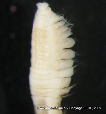 Especie delgada y larga, de aprox 25mm de longitud, con alrededor de 60 segmentos. Prostomio triangular a forma de campana, ancho en el margen anterior, algunas veces con una incisión media leve, con cortos procesos dirigios lateralmente; carúncula corta, terminando en medio del setígero 1; sin tentáculos occipitales; 2 pares de ojos presentes o ausentes; en caso de estar presentes organizados trapezoidalmente, con el par anterior más ampliamente espaciado y en forma de taza; órganos nucales presentes o ausentes. Peristomio moderadamente desarrollado como dos protuberancias laterales, sin formar alas. Setígero 1-4 dorsalmente elevado, con largas lamelas notopodiales postsetales, los subsecuentes setígeros son más cortos, llegando a ser regordetes en apariencia y reducidos a lóbulos como dedos en el setígero 9. Neurópodo del setígero 1-2 como dedos, en los segmentos subsecuentes más pequeños, redondeados. Crestas ciliadas medio-dorsales desde setígero 19-20, continuando al extremo posterior. Setígero 9-14 con material glandular, a veces pigmentado de color oscuro. Largas notosetas capilares anteriores, no granuladas, con vainas estrechas; notópodos de los setígeros posteriores con 1 ó 2 capilares inusualmente largos, aplanados, y distalmente curvados entre capilares normales; cada capilar largo engrosado, no granulado, puntiagudo con estrecha vaina. Neurópodos anteriores con capilares cortos, amplios, bilimbados, con ejes finamente granulados; fascículos organizados en dos filas; setígero 1 con 1-2 espinas grandes curvadas sumado a los capilares; única seta sable inferior desde el setígero 4-6, cada una fuertemente granulada cerca de la punta; ganchos neuropodiales desde el setígero 13, con 5-6 por neurópodo, acompañados por una seta sable inferior; ganchos cuadridentados con el diente principal sobremontado por un único diente y un par de dientes pequeños, aparecen tridentadas en vista lateral; no encapuchados. Los segmentos glandulares 9-14 con 1 ó 2 pequeñas setas puntiagudas. Pigidio con dos cirros anales (Blake, 1997).